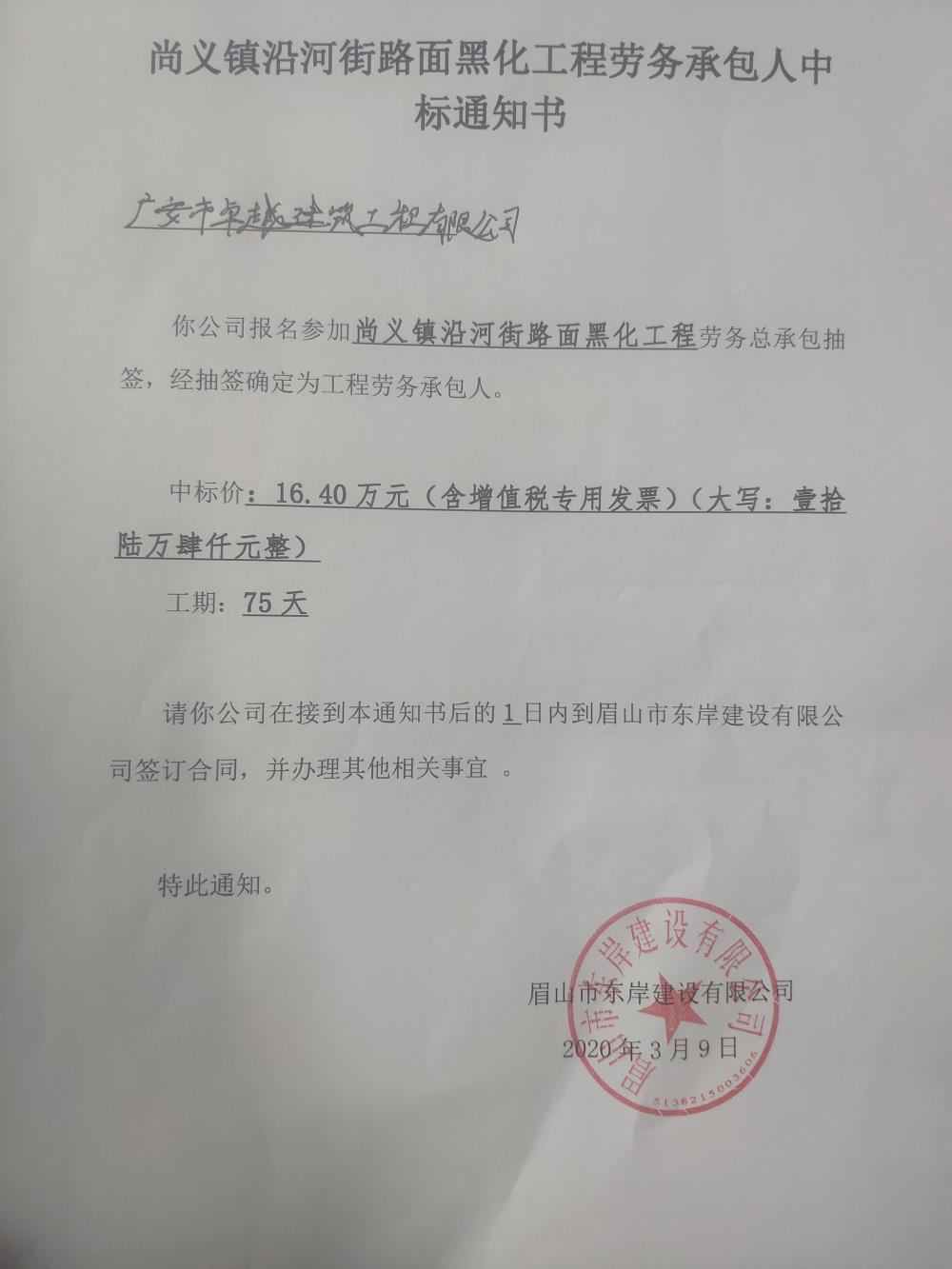 尚義鎮(zhèn)沿河街路面黑化工程中標(biāo)通知
